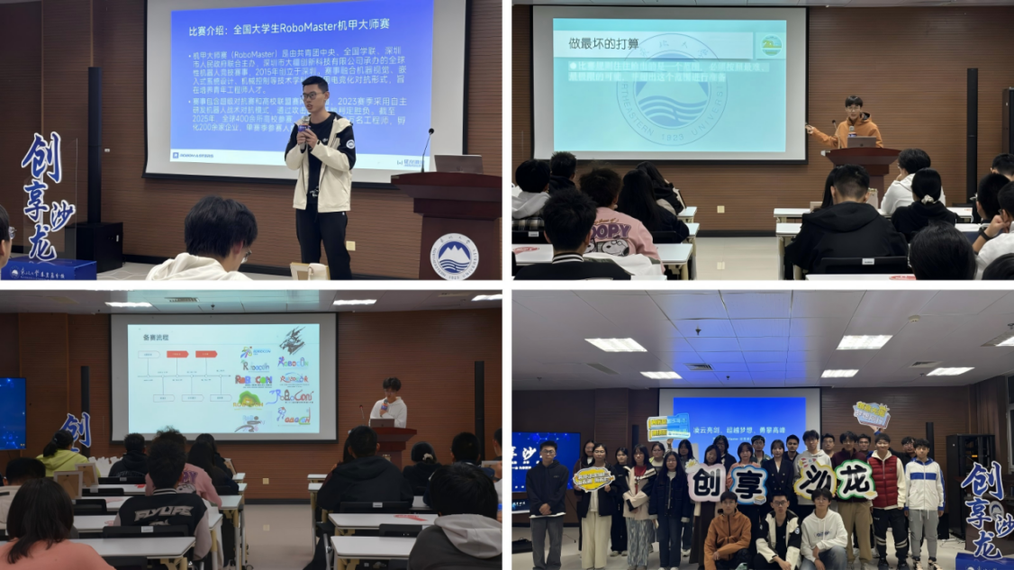 10月17日,由大学生创新创业中心指导、大学生创新创业协会主办的第九十六期创享沙龙在科技楼9024室举办。活动以“探秘‘技术+战术’的进阶密码”为主题,邀请智能汽车创新团队、ROBOCON团队与RoboMaster团队成员担任主讲。围绕三项高水平赛事,主讲人从机械设计、智能控制到算法优化、团队协作等方面分享了技术核心与实战经验,通过团队分享、互动交流与成果展示,帮助同学们深化了对技术综合应用与工程探索的认知,激发了大家投身科技创新实践的热情。