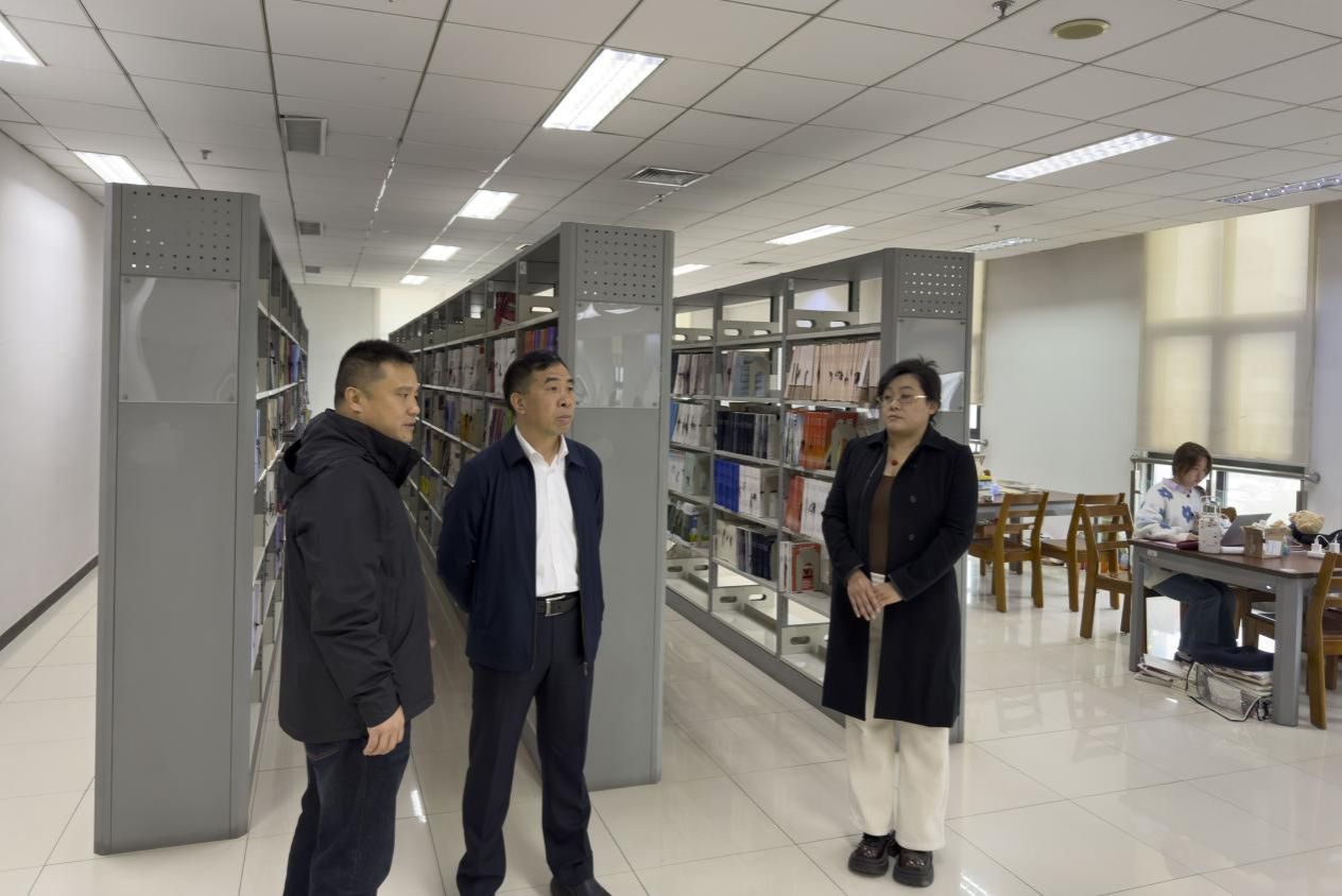 调研中,张玉宝实地查看了新近启用的智能书架与“AI馆员墨团”,深入了解设备运行及师生使用反馈情况,走访了新建的RFID智能密集书库与社会科学图书阅览区、报刊阅览区、特藏图书阅览区,听取智慧化服务与空间改造工作的汇报。在资源建设部、信息服务部和知识产权服务部,工作人员介绍了近年来图书馆在文献资源建设、信息素养教育、嵌入式学科服务等方面的探索与实践,展示了在知识产权服务领域取得的成果。