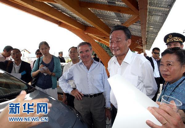 吴委员长对陪同考察的法国国民议会议长阿夸耶说:“目前中国风电装机容量达到2200万千瓦,光伏发电量达到15万千瓦时,规划到2020年将分别增加到1.5亿千瓦和2000万千瓦时。中国西北地区具有较好的光热条件和风力资源,而且中国风电装备和光伏电池生产能力也位居世界前列。这为中法经贸合作提供了新的机遇。两国企业应当在现有合作基础上,通过开展联合研究、建设示范工程、共同开发技术、扩大相互投资等形式,加强清洁能源、智能电网等领域的互利合作,使这些领域成为中法经贸合作新的增长点。”阿夸耶说:“同中国一样,法国将发展太阳能等清洁能源作为经济政策的重点,两国战略性新兴产业合作的机遇前所未有。法国政府和议会支持法方企业与中国企业密切合作,欢迎中国企业参与法国太阳能电站建设。”