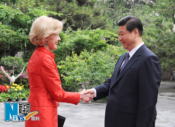 资料图片 6月9日,国家副主席习近平在北京钓鱼台国宾馆会见来华出席上海世博会澳大利亚国家馆日和澳大利亚文化年活动的澳大利亚总督布赖斯。新华社记者李学仁摄