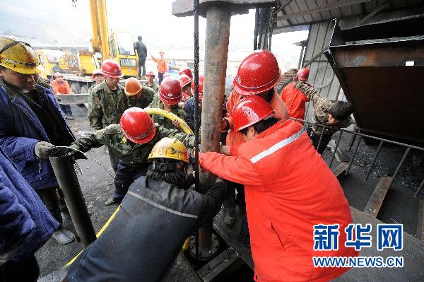 6月4日,天安公司郊南煤矿事故现场,救援工人正在安装抽水管道。 新华社记者 范敏达 摄