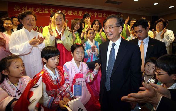 11时30分许,当温家宝在中心门口下车时,10多名身着民族服装的韩国小学生唱起中文歌曲,欢迎中国总理的到来。韩国小女孩金泠抒的父亲是韩国人、母亲是中国人。她向温总理献上一束鲜花。温家宝总理接过鲜花,在孩子们的簇拥下走进文化中心。