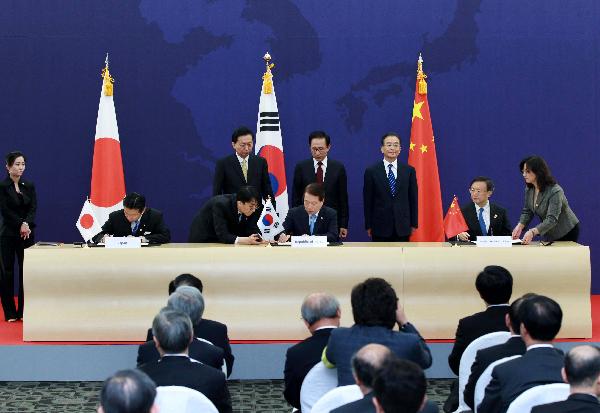 5月30日,第三次中日韩领导人会议第二阶段会议在韩国济州岛举行。这是会后三国领导人出席《中日韩三国合作秘书处备忘录》签字仪式。新华社记者 庞兴雷 摄