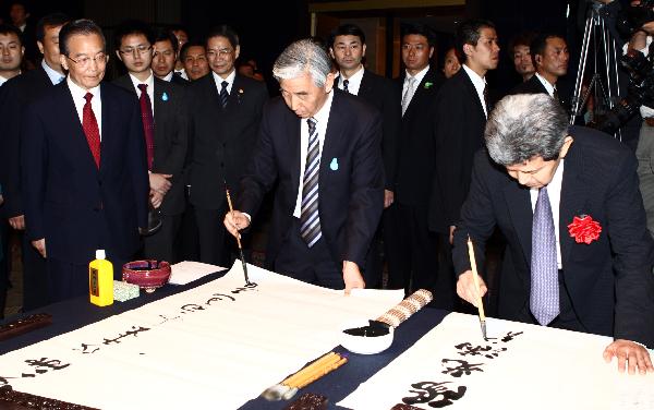 5月31日,中国国务院总理温家宝在日本东京与为中日文化交流作出贡献的日本文化界知名人士座谈。这是座谈会后,温家宝观看中日两国书法家现场创作。新华社记者姚大伟摄