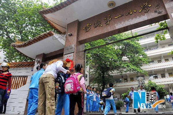 4月29日早晨,雷州市雷城第一小学的学生步入校门上课。 4月28日15时左右,广东省湛江市下辖雷州市雷城第一小学发生校园行凶案。一名男子冲进校园,持刀砍伤15名学生和1名教师,1名学生在逃跑时摔伤。4月29日雷州市雷城第一小学正常上课,并对学生进行心理辅导。新华社记者 陈晔华摄