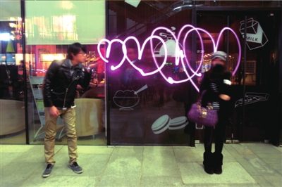 两名网友在朝外SOHO享受光影涂鸦的乐趣