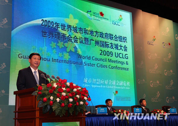 世界城市和地方政府联合组织世界理事会会议暨广州国际友城大会在穗举行 习近平出席开幕式并发表重要演讲 新华网广州11月13日电(记者 郑天虹)世界城市和地方政府联合组织世界理事会会议暨广州国际友城大会13日在广州举行,来自60多个国家、210多个城市和地方组织逾千名代表出席大会。中共中央政治局常委、国家副主席习近平出席开幕式并发表重要演讲。 习近平首先代表中国政府和人民向大会召开表示热烈祝贺,向各位与会代表特别是远道而来的外国朋友表示诚挚欢迎。他说,世界城市和地方政府联合组织已成为全球城市开展多边交往合作的重要平台,成为世界各国城市增进友谊、加强合作的桥梁和纽带。习近平表示相信,世界城市和地方政府联合组织必将广泛凝聚各国人民在城市建设和管理上的智慧和力量,为共同促进人类和平与发展的崇高事业不断发挥积极作用。习近平还说,中国政府高度重视和积极支持国际友城活动。这一活动在促进中国同各国交流合作、增进中国人民同世界各国人民相互了解和友谊方面发挥了不可替代的重要作用。他表示,中国政府愿同世界各友好城市一道,共同把这项活动不断提高到新水平。 习近平指出,当前,世界经济正处在从国际金融危机导致的衰退走向复苏的关键时刻。这次会议以“城市智慧应对全球金融危机”为主题,是审时度势之举、顺势而为之策。习近平就各国城市和地方政府共同应对国际金融危机问题提出三点建议:一是深化务实合作,继续同舟共济、共克时艰,进一步深化和拓展经贸、科技、人文等各领域交流合作,为推动世界经济尽快恢复增长、实现互利共赢各展所长、各尽其力。二是坚持对外开放,彼此尊重、相互开放、互信包容、精诚合作,充分利用经济互补优势,促进市场开放和共同发展,以实际行动抵制贸易和投资保护主义。三是加快创新发展,充分运用智力资源,积极调整发展战略、创新发展模式,加快培育和打造新的经济增长点,催生国际产业结构新一轮调整,增强城市经济增长内在动力和创新活力。 习近平在演讲中介绍了新中国成立60年来特别是改革开放30年来经济社会发展的成就和中国工业化、城市化进程明显加快的情况。他说,30年来,中国工业化和城市化进程明显加快。1978年中国城市化率仅17.9%,到2008年底已达到45.7%,年均增长近1个百分点。亿万农民进入城市,既带动了中国农业和农村现代化进程,又为城市经济社会发展增添了新的活力。 习近平还介绍了中国为应对国际金融危机采取的政策措施和成效。他说,当前,世界经济虽已出现积极变化,但实现全面复苏将是缓慢和曲折的过程。中国愿同世界各国一道,继续为推动世界经济尽快恢复增长作出积极贡献。他表示,中国在努力保持自身经济平稳较快发展的同时,将继续积极参与应对国际金融危机的各项国际合作,为推动世界经济复苏作出应有贡献。中国还将继续本着负责任的态度,认真落实各项对外援助承诺和举措,继续支持发展中国家应对国际金融危机冲击,共同推动联合国千年发展目标的实现。 中共中央政治局委员、广东省委书记汪洋在开幕式上致辞,广东省省长黄华华、中国人民对外友好协会会长陈昊苏等出席开幕式。 世界城市和地方政府联合组织(UCLG)成立于2004年5月,是目前世界上最大的地方政府联合组织。广州市市长目前担任该组织联合主席。世界理事会是该组织主要决策机构。2005年6月,北京市人民政府与中国人民对外友好协会曾联合举办UCLG世界理事会会议。