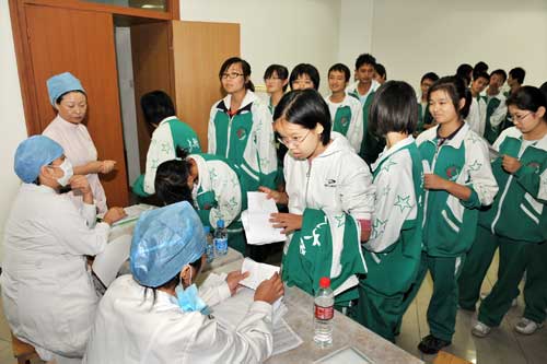 民族大学附中的学生们在填写甲型H1N1流感疫苗知情同意书。摄影:杨民 (来源:中国广播网)