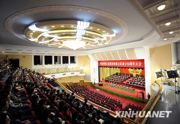 党和国家领导人吴邦国、温家宝、李长春、习近平、李克强、贺国强、周永康出席大会。大会由中共中央政治局常委、全国政协主席贾庆林主持。 全国政协礼堂会场内鲜花竞放,喜气洋洋。主席台台口上方是“庆祝中国人民政治协商会议成立60周年大会”的会标,后幕正中悬挂着政协会徽,下方是红色字标“1949-2009”,两侧是10面鲜艳的红旗。 上午10时,大会开始。全体起立,唱国歌。 胡锦涛在讲话中强调,中国人民政治协商会议是中国人民爱国统一战线的组织,是中国共产党领导的多党合作和政治协商的重要机构,是我国政治生活中发扬社会主义民主的重要形式。中国人民政治协商会议是中国共产党把马克思列宁主义统一战线理论、政党理论、社会主义民主政治理论同中国具体实践相结合的伟大创造,是中国共产党同各民主党派和无党派人士、各人民团体和各族各界人士风雨同舟、团结奋斗的伟大成果。