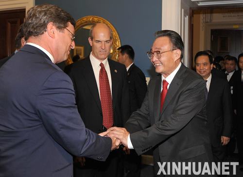9月9日,正在美国进行正式友好访问的全国人大常委会委员长吴邦国在华盛顿会见美国众议院美中议会交流小组主席克劳利、副主席曼祖洛,美中工作小组共同主席拉森,中国小组共同主席鲍戴洛、福布斯等。新华社记者马占成摄