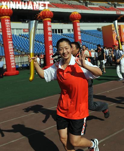 9月1日,中国国家羽毛球队运动员张亚雯手持火炬进行传递。当日,第十一届全国运动会火炬传递活动在重庆市传递。新华社记者周衡义摄