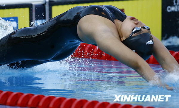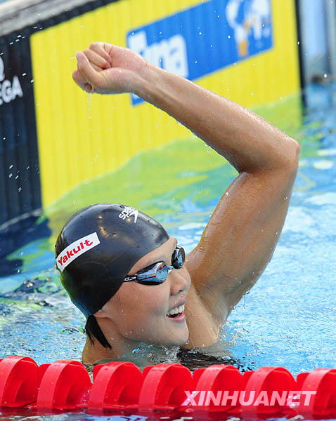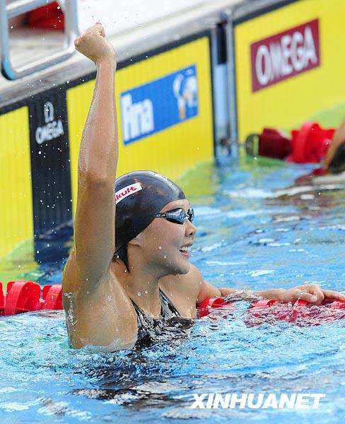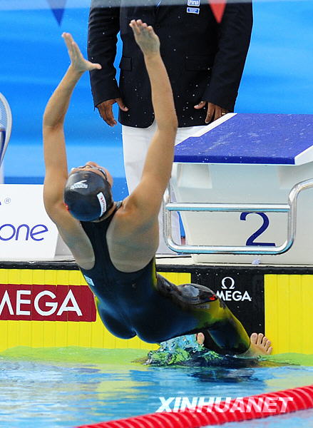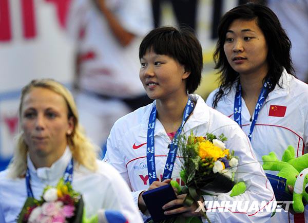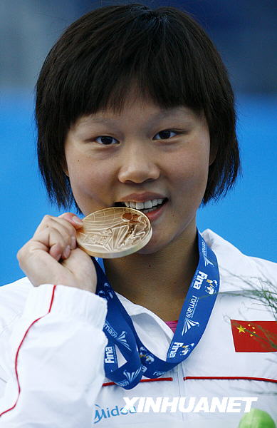 7月30日,在意大利罗马举行的第13届世界游泳锦标赛女子50米仰泳决赛中,中国选手赵菁以27秒06的成绩夺得金牌并打破世界纪录,队友高畅以27秒28的成绩夺得铜牌。这是赵菁在颁奖典礼上。新华社记者张玉薇摄
