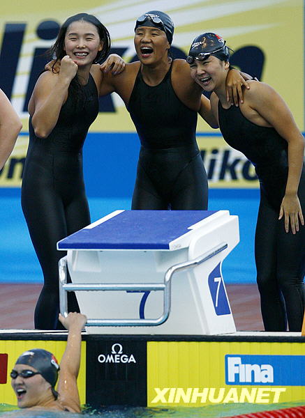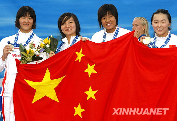 7月30日,在意大利罗马举行的第13届世界游泳锦标赛女子4X200米自由泳决赛中,中国队以7分42秒08的成绩夺得金牌并打破世界纪录。这是中国选手庞佳颖、刘京、朱倩蔚和杨雨(从左到右)在颁奖典礼上。新华社记者张玉薇摄