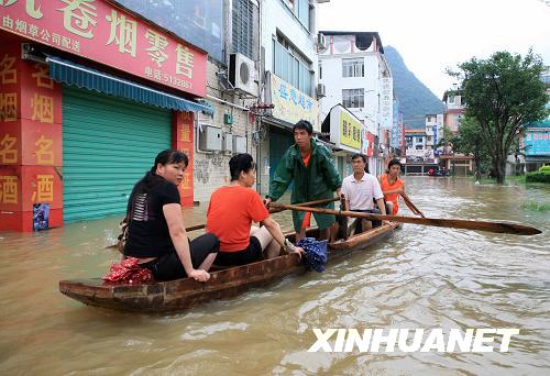 7月3日,在广西融水苗族自治县县城,人们坐着小船出行。7月2日至3日,广西部分地区出现大雨到暴雨,局部大暴雨,暴雨中心位于河池市罗城和柳州市融水、融安、三江以及桂林市兴安、临桂一带。截至3日14时,共造成27.68万人受灾,4人失踪。广西防汛部门已紧急启动防汛Ⅲ级应急响应。新华社发(龙涛 摄)