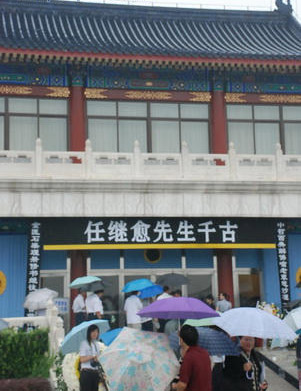 17日清晨,北京天降大雨。任继愈先生遗体告别仪式今日上午在北京八宝山殡仪馆东礼堂举行。各界人士冒着倾盆大雨,赶到八宝山殡仪馆送别任老,表达对大师的哀思。8时30分左右,前来送别任继愈先生的各界群众在殡仪馆东礼堂外排起了长队。任继愈先生的生前友好,学界同仁,后生晚辈,全国文化界、图书馆界代表、员工以及社会各界群众近三千人冒雨前来送别任老。