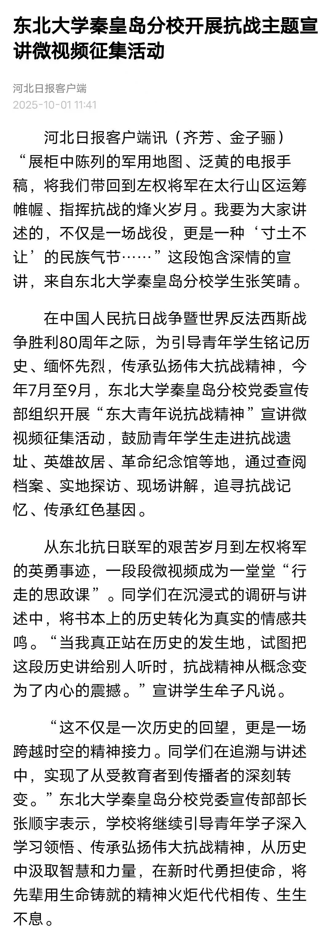 “这不仅是一次历史的回望,更是一场跨越时空的精神接力。同学们在追溯与讲述中,实现了从受教育者到传播者的深刻转变。”东北大学秦皇岛分校党委宣传部部长张顺宇表示,学校将继续引导青年学子深入学习领悟、传承弘扬伟大抗战精神,从历史中汲取智慧和力量,在新时代勇担使命,将先辈用生命铸就的精神火炬代代相传、生生不息。