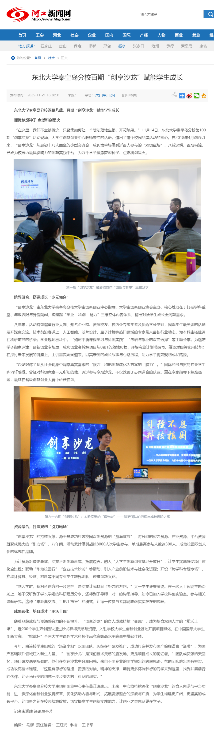 东北大学秦皇岛分校大学生创新创业中心主任吕江涛表示,未来,中心将持续强化“创享沙龙”的育人内涵与平台功能,进一步深化创新创业教育改革,优化活动内容与形式,拓展资源整合的深度与广度,为学生构建更广阔、更坚实的成长平台,让创新之花在校园肆意绽放,切实提高学生创新实践能力,让创业之果惠及更多学子。