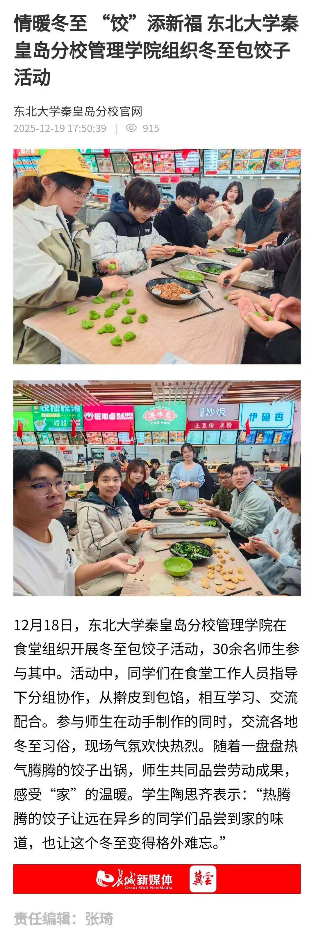 12月18日,东北大学秦皇岛分校管理学院在食堂组织开展冬至包饺子活动,30余名师生参与其中。活动中,同学们在食堂工作人员指导下分组协作,从擀皮到包馅,相互学习、交流配合。参与师生在动手制作的同时,交流各地冬至习俗,现场气氛欢快热烈。随着一盘盘热气腾腾的饺子出锅,师生共同品尝劳动成果,感受“家”的温暖。学生陶思齐表示:“热腾腾的饺子让远在异乡的同学们品尝到家的味道,也让这个冬至变得格外难忘。”