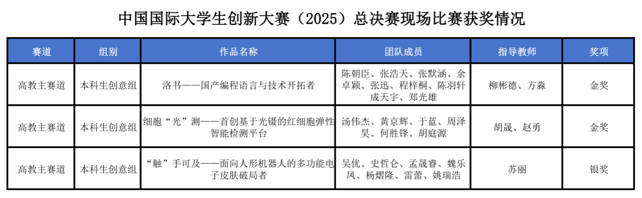 自2024年10月起,我校启动中国国际大学生创新大赛重点项目遴选与培育工作,秉持“早启动、广宣传、重能力、精培育”的工作思路,系统推进项目挖掘与培育,多次邀请校内外专家围绕项目评分要点、项目逻辑、内容凝练、商业思维逻辑等方面,对进入国赛现场赛团队进行专业化打磨和针对性指导,全面保障项目质量,为优异成绩的取得奠定了坚实基础。经过国赛网络评审、现场赛答辩,我校参赛作品《洛书——国产编程语言与技术开拓者》以小组赛第一名的成绩获得金奖;参赛作品《细胞“光”测——首创基于光镊的红细胞弹性智能检测平台》获得金奖;《“触”手可及——面向人形机器人的多功能电子皮肤破局者》获得银奖。