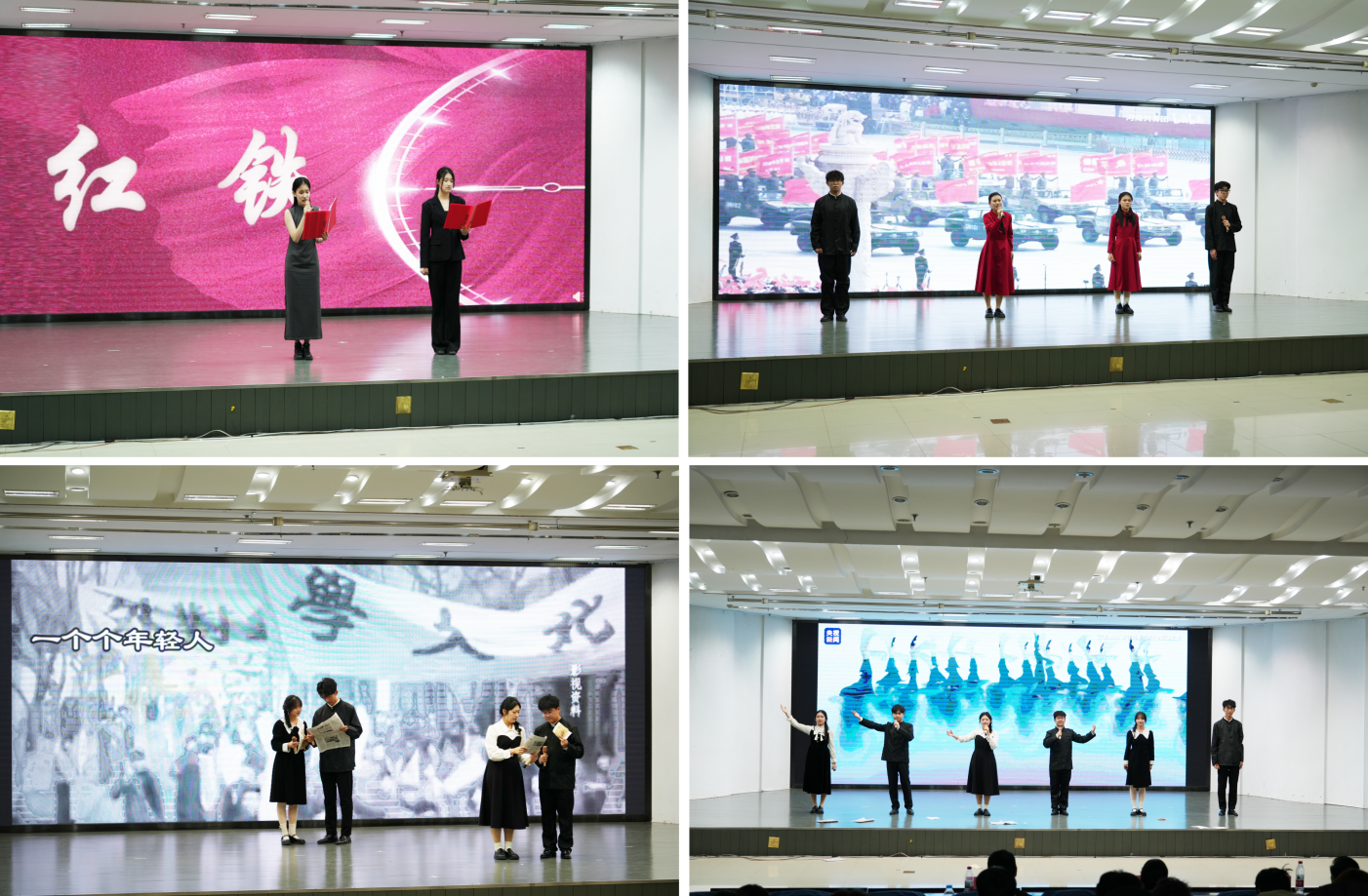 本次朗诵会以诗诵史、以声传情,分为“山河入梦·赤心铭刻”“薪火不息·精神赓续”“时代回响·勇毅前行”三个主题篇章,旨在弘扬爱国主义精神,激励师生铭记历史、勇担使命,将爱国情、强国志转化为报国行,为实现中华民族伟大复兴贡献力量。第一篇章中,《山河不会忘记》《我用残损的手掌》《乳娘》《我爱这土地》等作品,以饱含深情的朗诵,讲述了中华儿女在苦难中的坚韧不屈与对山河家园的深沉热爱。第二篇章中,《茅草屋中的读书声》《民族的丰碑》《不朽》《红铁》等作品,深情歌颂了先辈们在艰难困苦中追寻光明、传承文明的坚定步履,讴歌了用生命与热血铸就的民族精神丰碑。第三篇章中,朗诵者以《人民万岁》致敬人民创造历史的伟大力量,朗诵会在集体合诵《共振时光,吾辈自强》中圆满落幕。
