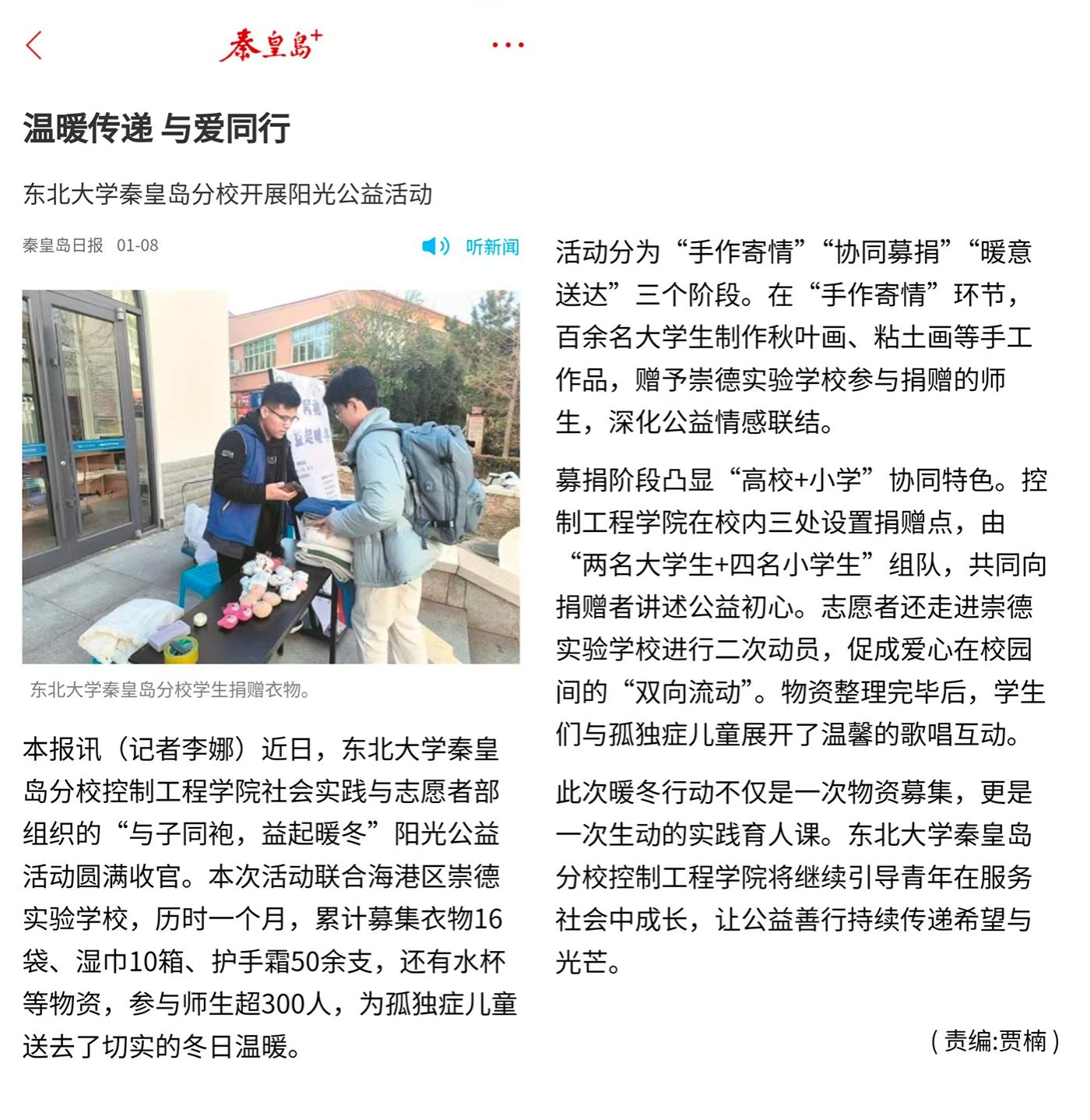此次暖冬行动不仅是一次物资募集,更是一次生动的实践育人课。东北大学秦皇岛分校控制工程学院将继续引导青年在服务社会中成长,让公益善行持续传递希望与光芒。