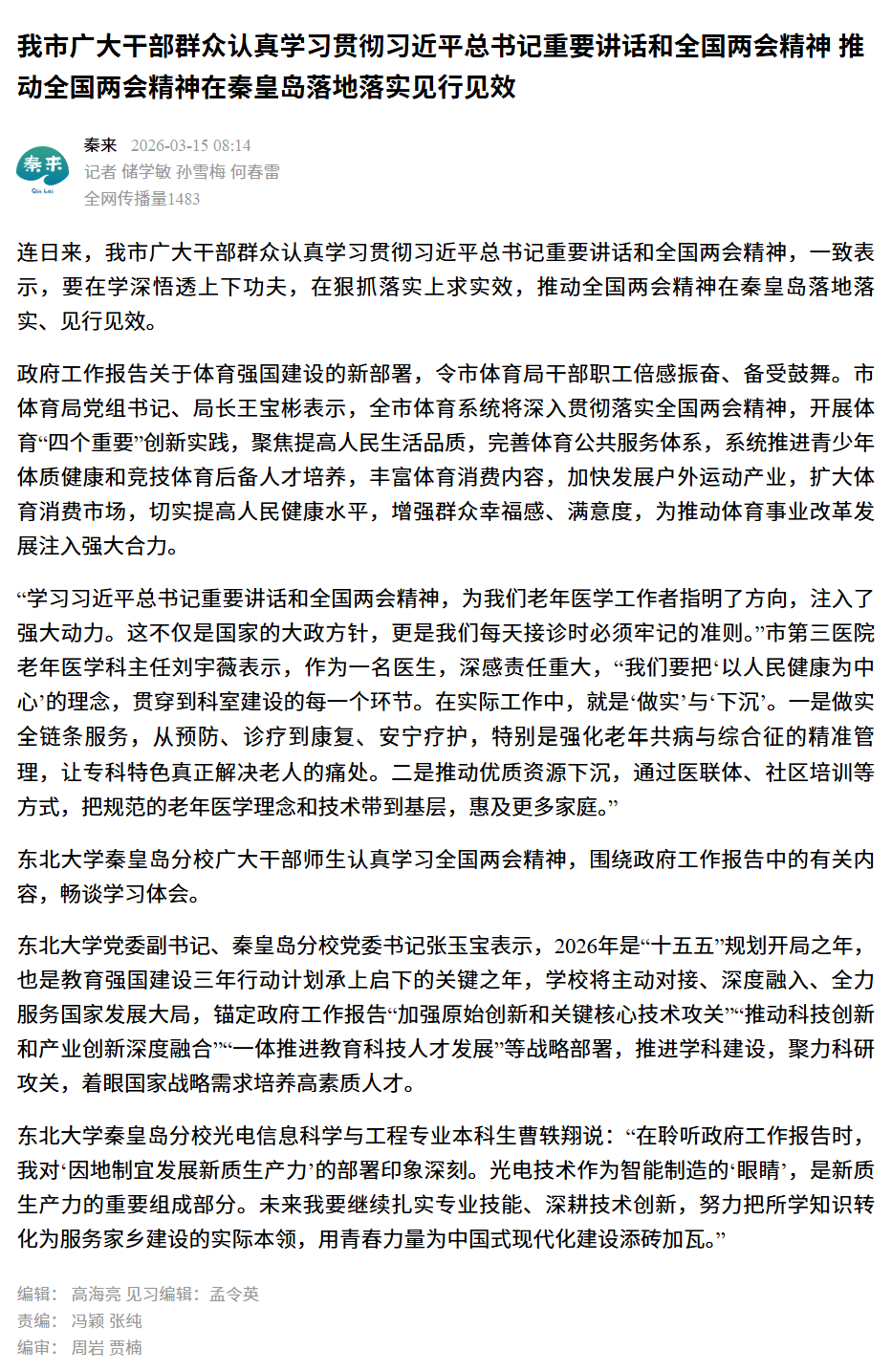 连日来,我市广大干部群众认真学习贯彻习近平总书记重要讲话和全国两会精神,一致表示,要在学深悟透上下功夫,在狠抓落实上求实效,推动全国两会精神在秦皇岛落地落实、见行见效。
