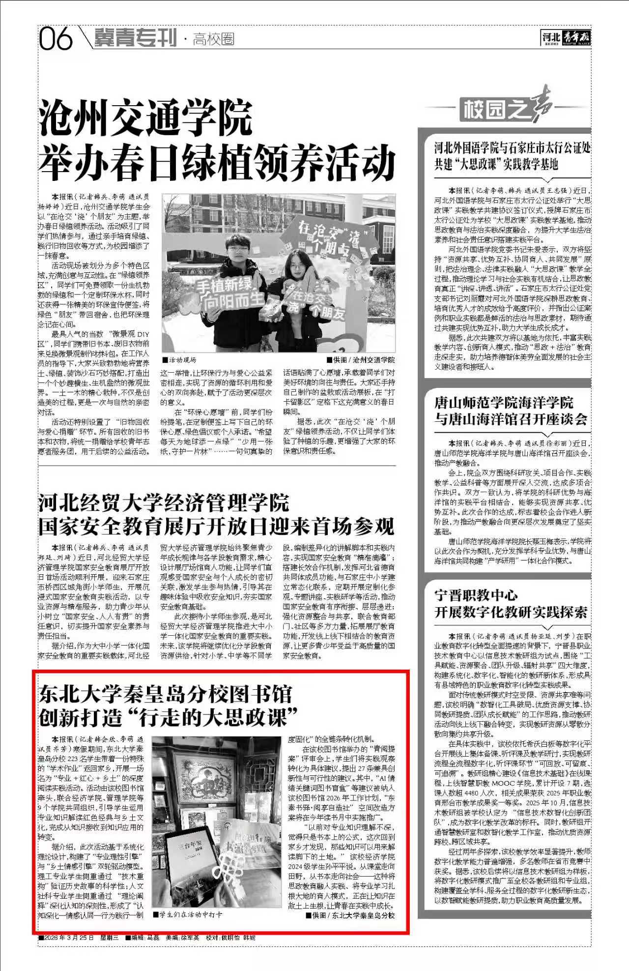 本报讯(记者韩会欣、李萌 通讯员齐芳)寒假期间,东北大学秦皇岛分校223名学生带着一份特殊的“学术作业”返回家乡,开展一场名为“专业+红心+乡土”的深度阅读实践活动。活动由该校图书馆牵头,联合经济学院、管理学院等9个学院共同组织,引导学生运用专业知识解读红色经典与乡土文化,完成从知识接受到知识应用的转变。