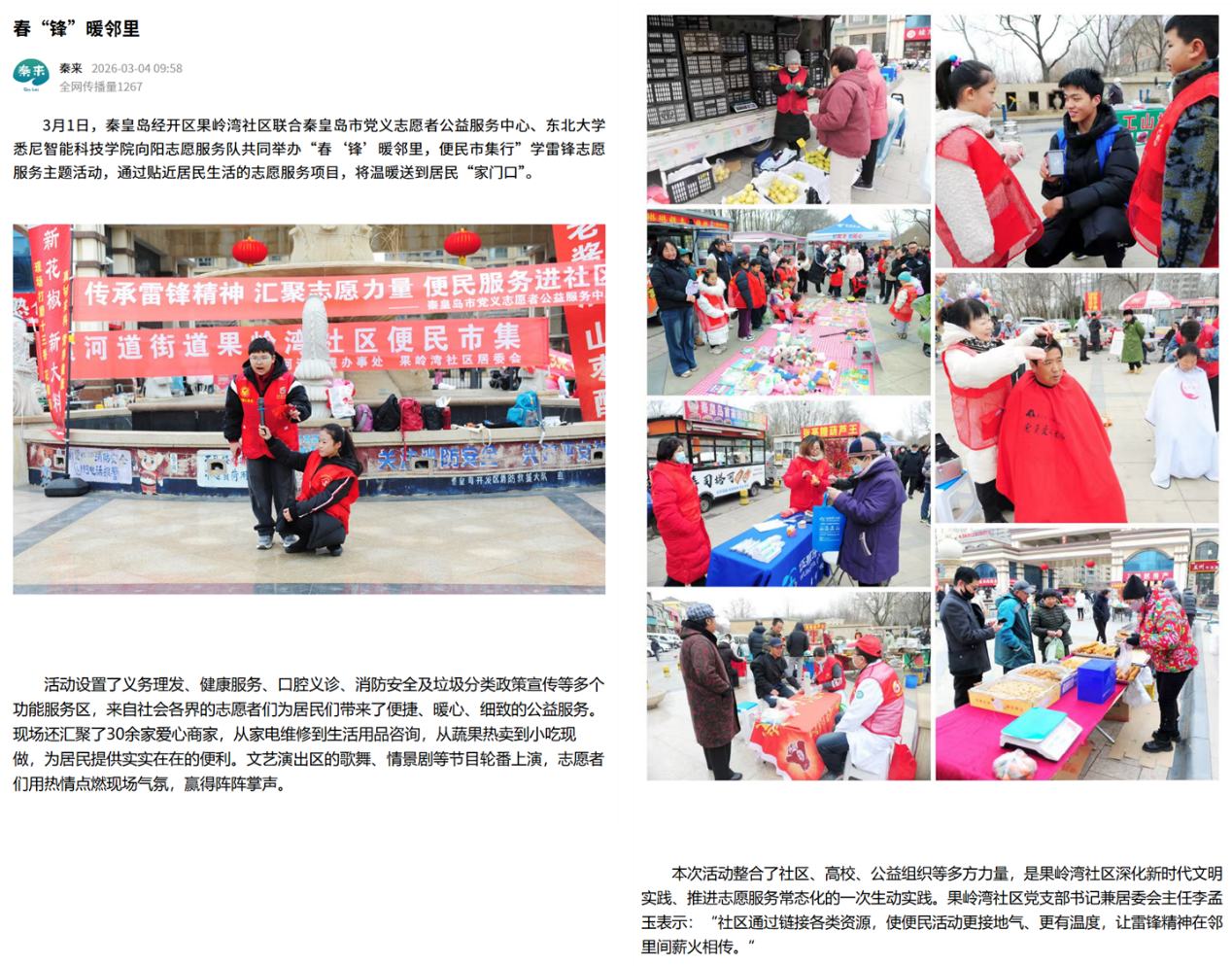 3月1日,秦皇岛经开区果岭湾社区联合秦皇岛市党义志愿者公益服务中心、东北大学悉尼智能科技学院向阳志愿服务队共同举办“春‘锋’暖邻里,便民市集行”学雷锋志愿服务主题活动,通过贴近居民生活的志愿服务项目,将温暖送到居民“家门口”。