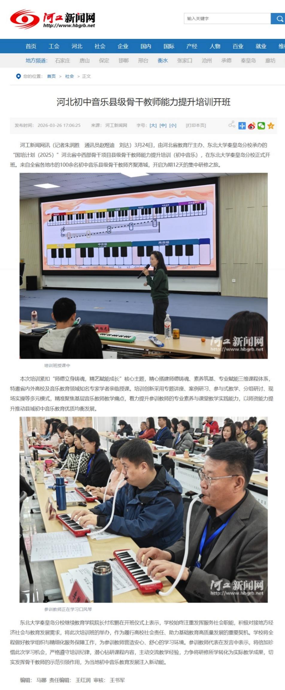 东北大学秦皇岛分校继续教育学院院长付宏鹏在开班仪式上表示,学校始终注重发挥服务社会职能,积极对接地方经济社会与教育发展需求,将此次培训班的举办,作为履行高校社会责任、助力基础教育高质量发展的重要契机。学校将全程做好教学组织与精细化服务保障工作,为参训教师营造安心、舒心的学习环境。参训教师代表在发言中表示,将倍加珍惜此次学习机会,严格遵守培训纪律,潜心钻研课程内容,主动交流教学经验,力争将研修所学转化为实际教学成果,切实发挥骨干教师的示范引领作用,为当地初中音乐教育发展注入新动能。