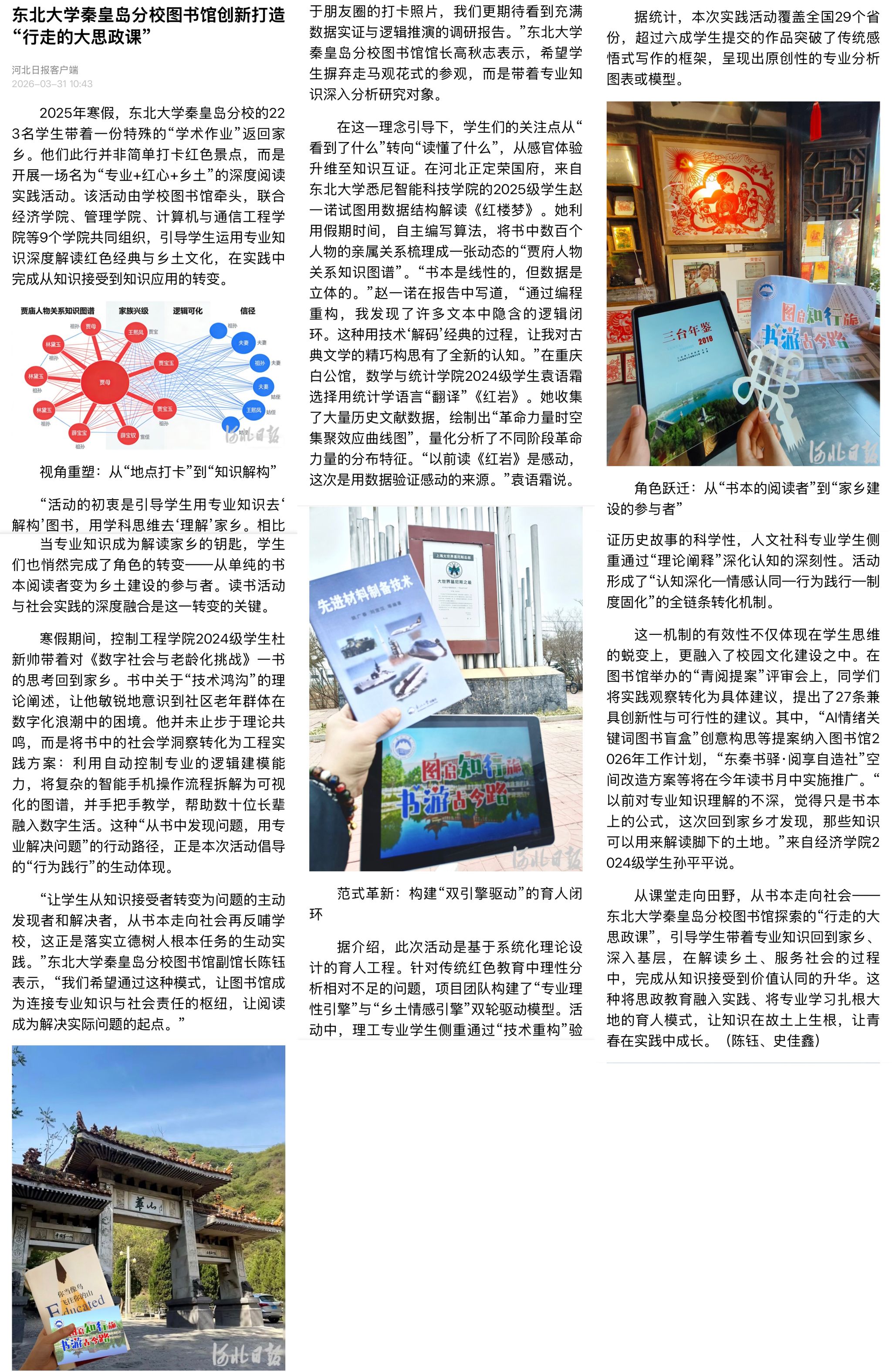 从课堂走向田野,从书本走向社会——东北大学秦皇岛分校图书馆探索的“行走的大思政课”,引导学生带着专业知识回到家乡、深入基层,在解读乡土、服务社会的过程中,完成从知识接受到价值认同的升华。这种将思政教育融入实践、将专业学习扎根大地的育人模式,让知识在故土上生根,让青春在实践中成长。(陈钰、史佳鑫)
