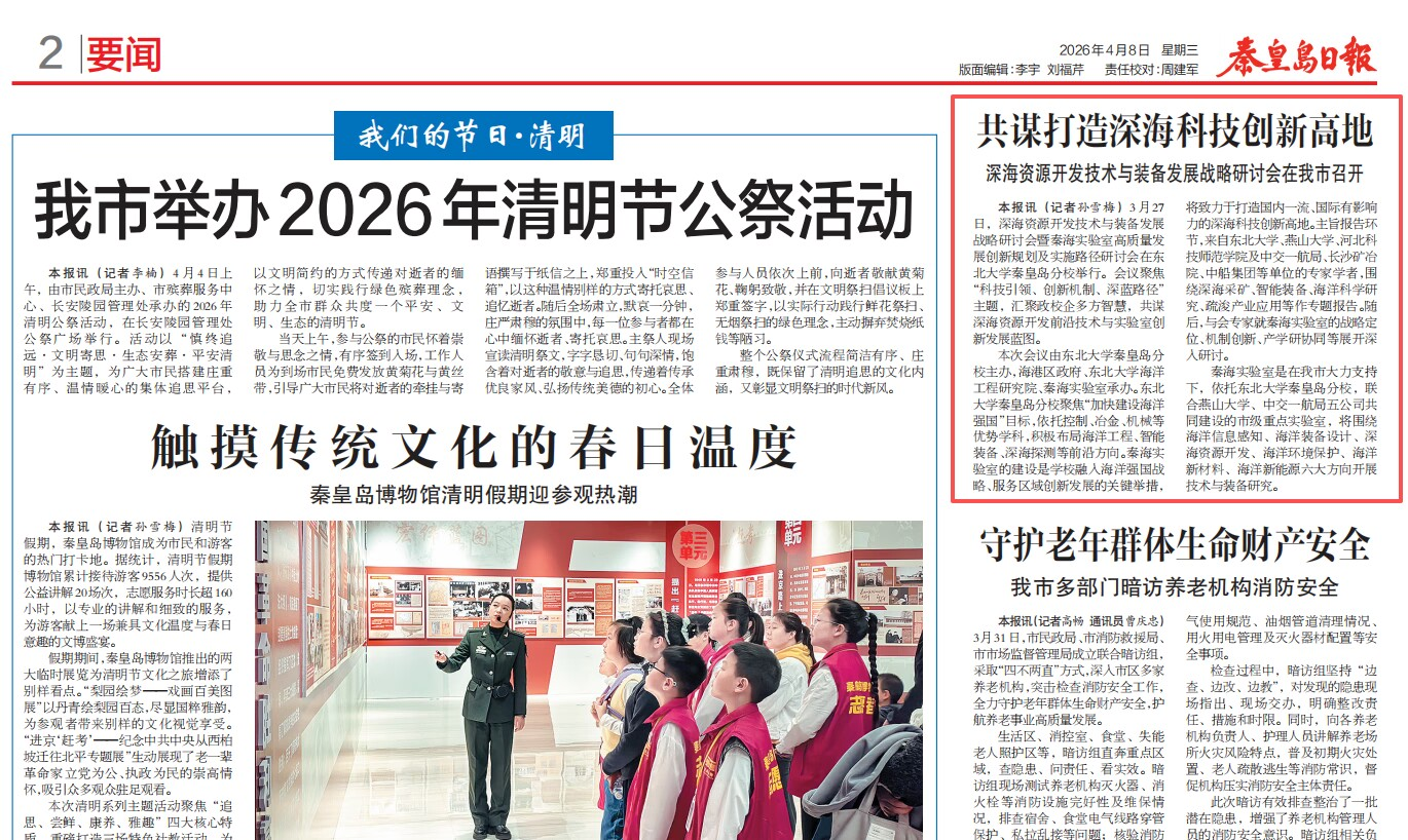 本报讯(记者孙雪梅)3月27日,深海资源开发技术与装备发展战略研讨会暨秦海实验室高质量发展创新规划及实施路径研讨会在东北大学秦皇岛分校举行。会议聚焦“科技引领,创新机制,深蓝路径”主题,汇聚政校企多方智慧,共谋深海资源开发前沿技术与实验室创新发展蓝图。