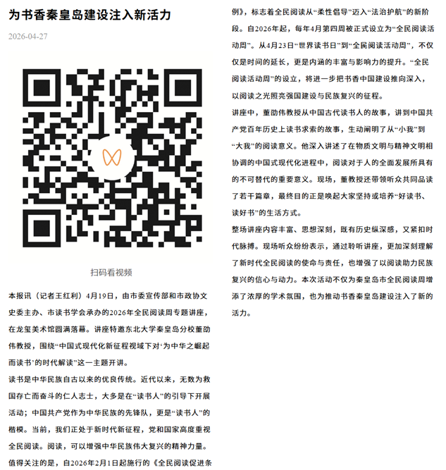 本报讯(记者王红利)4月19日,由市委宣传部和市政协文史委主办、市读书学会承办的2026年全民阅读周专题讲座,在龙玺美术馆圆满落幕。讲座特邀东北大学秦皇岛分校董劭伟教授,围绕“中国式现代化新征程视域下对‘为中华之崛起而读书’的时代解读”这一主题开讲。